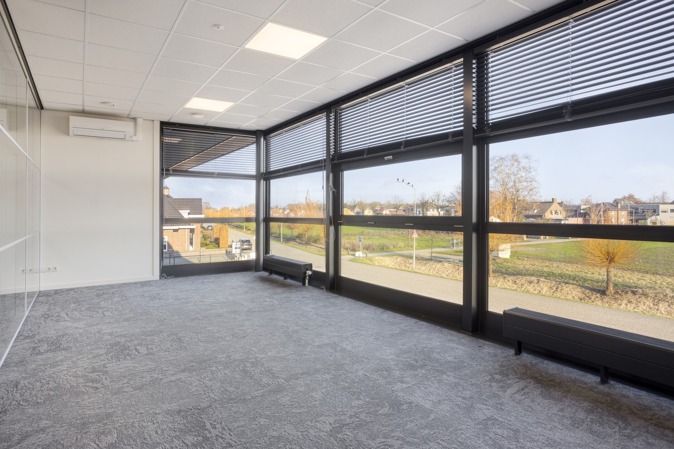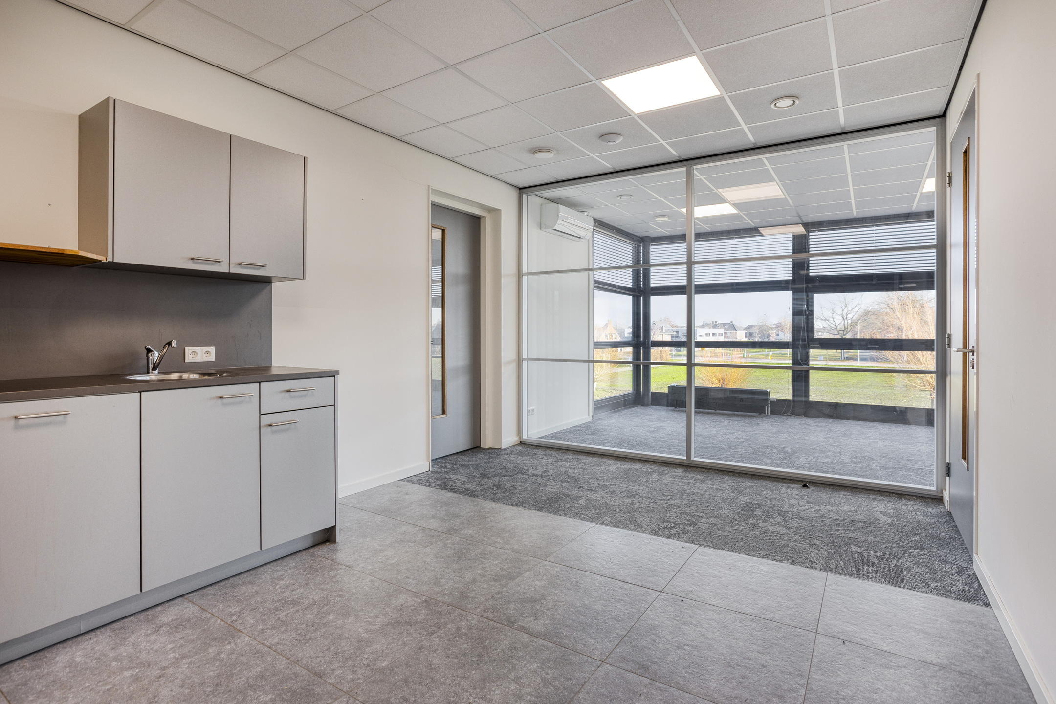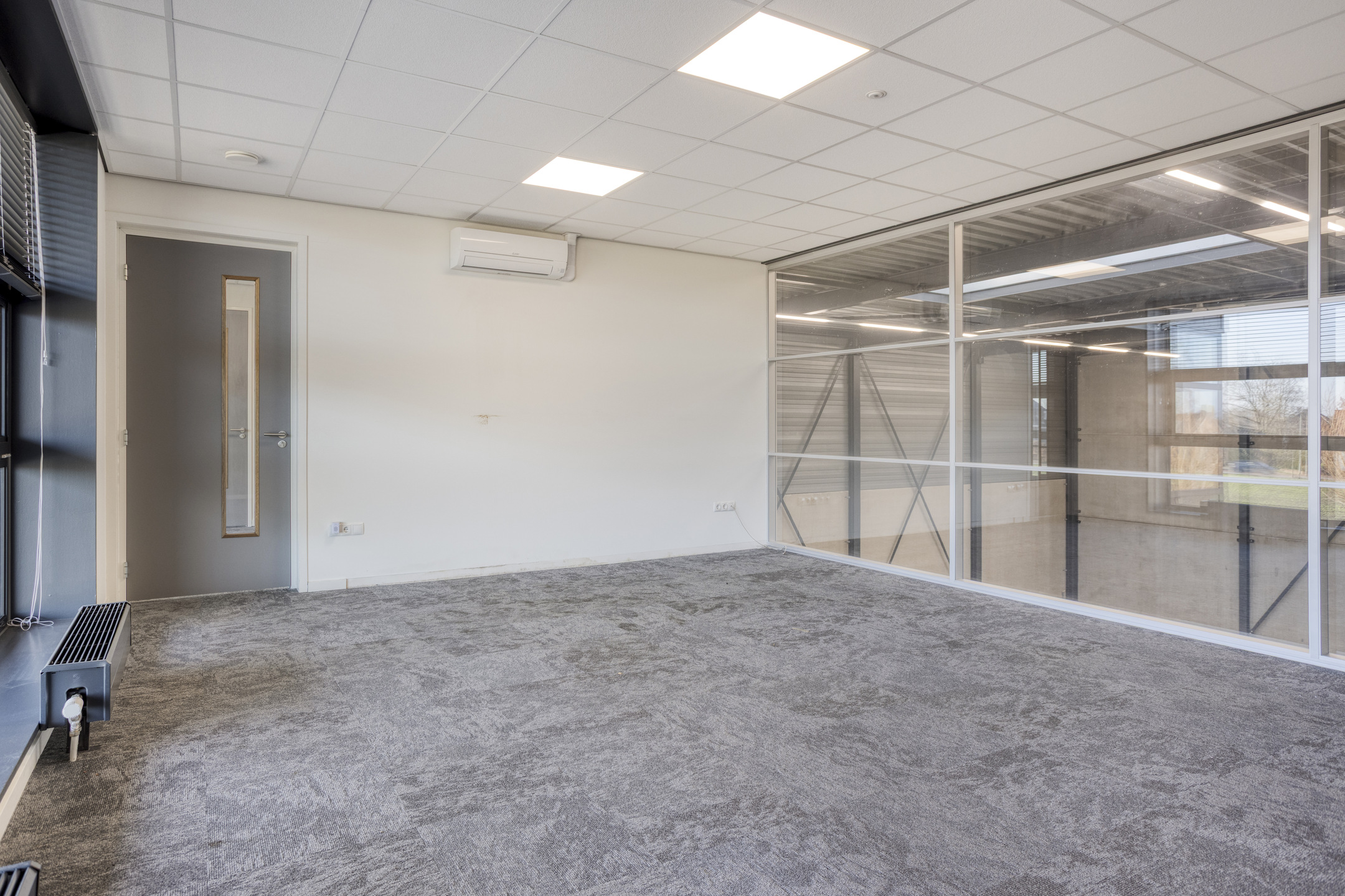 De kantoorruimte is voorzien van een eigen meterkast met volledige nutsaansluitingen, een 3x25 ampère krachtstroomaansluiting en een glasvezelaansluiting. De afwerking bestaat uit gevlinderde betonvloeren, grotendeels glazen scheidingswanden en een systeemplafond voorzien van LED-verlichting. Verwarming vindt plaats via een HR c.v.-installatie met convectoren en ventilatie geschiedt middels een WTW-unit. Zowel op de begane grond als op de eerste verdieping is een toilet met voorportaal en fonteintje aanwezig. Op de verdieping bevindt zich tevens een pantry. Daarnaast worden, buiten het gehuurde om en om niet aan huurder ter beschikking gesteld: airconditioning op de verdieping, vloerbedekking en lamellen.