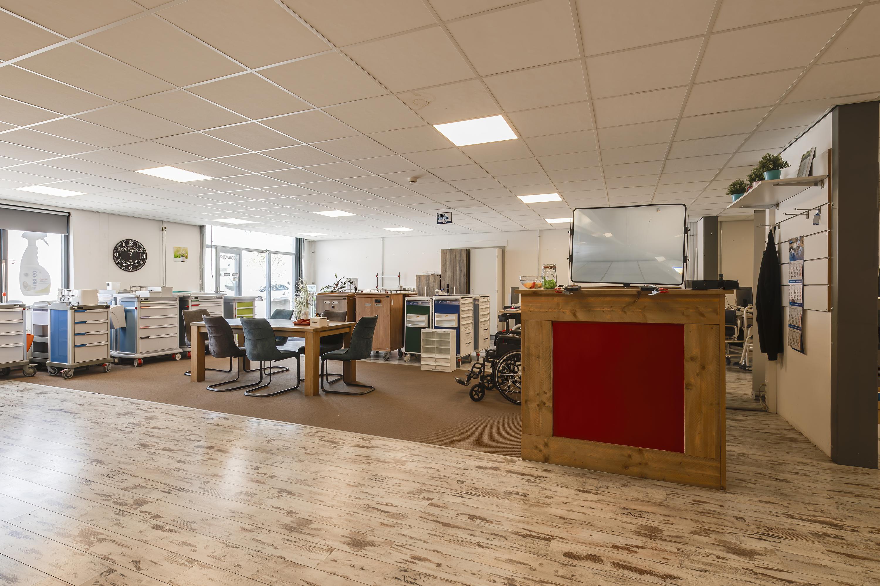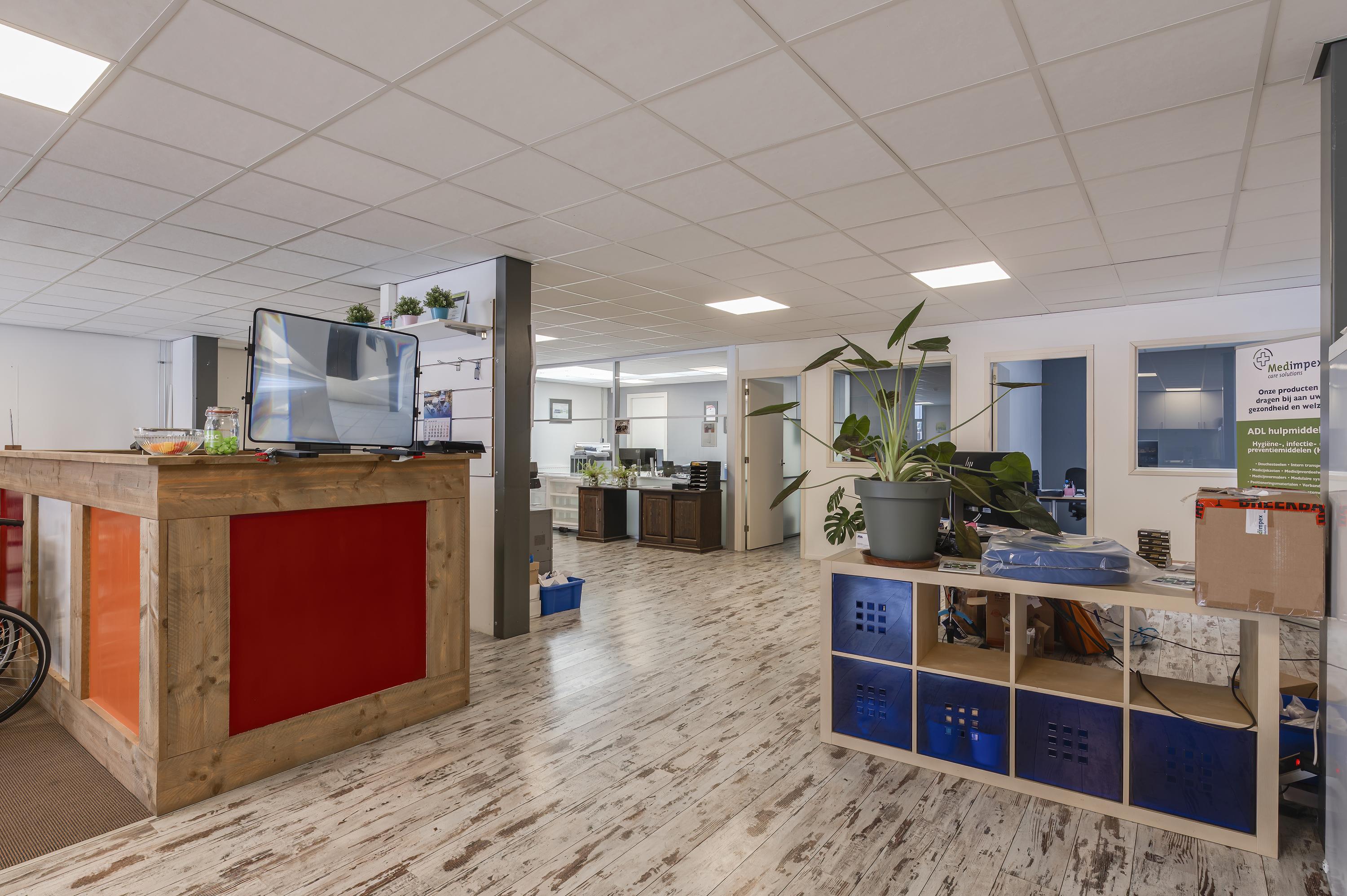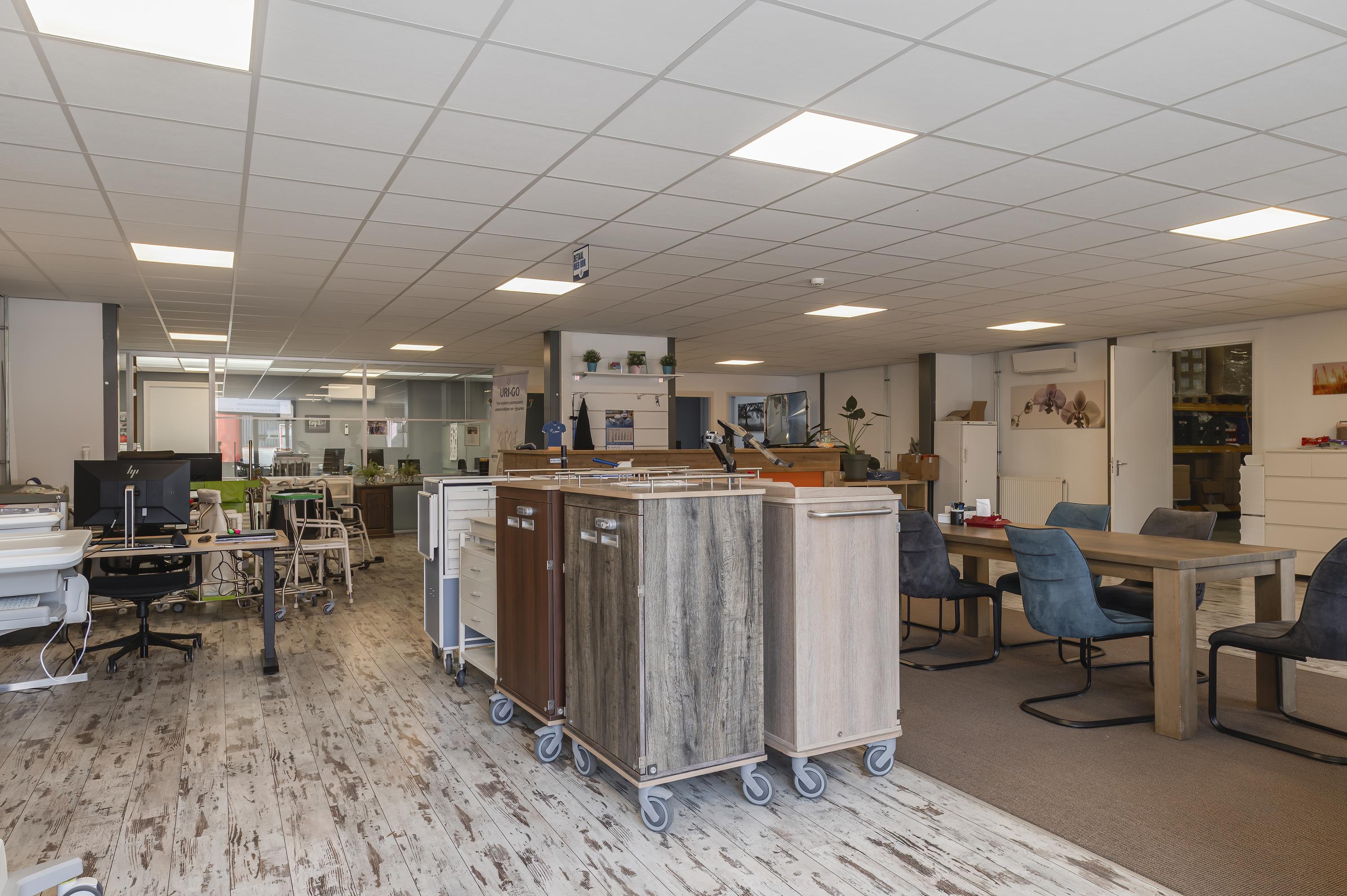 Begane grond: entree, voorportaal met pantry en toilet, kantoorruimte en grote bedrijfsruimte, momenteel hoogwaardig afgewerkt met showroom/kantoorinrichting met grote lichtstraat voor goed daglicht.