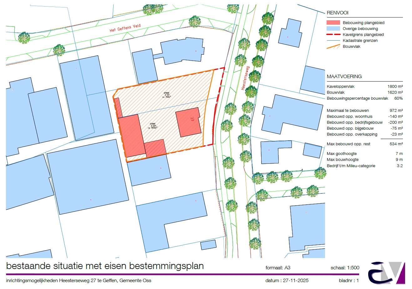 Het object is gelegen in het bestemmingsplan ‘Kom Geffen – 2016’ en valt binnen de bestemming ‘Bedrijf-1’ met functieaanduiding ‘bedrijf tot en met categorie 3.2’ en ‘bedrijfswoning’. Het bestemmingsplan staat zowel de bedrijfsactiviteiten als bewoning toe en hanteert een maximaal bebouwingspercentage van 60% binnen het bouwvlak. Een kopie van het bestemmingsplan is op aanvraag verkrijgbaar.