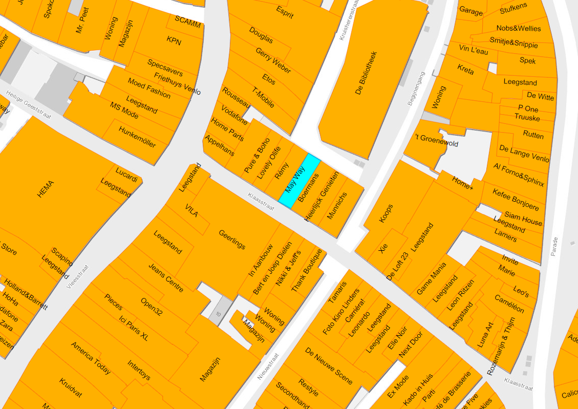 De winkelruimte is gelegen in de Klaasstraat, een karaktervolle en sfeervolle winkelstraat in het hart van de binnenstad van Venlo. De straat vormt een levendige verbinding tussen de Vleesstraat en de Parade en maakt deel uit van het kernwinkelgebied van Venlo. De Klaasstraat biedt een aantrekkelijk aanbod van lokale speciaalzaken en boetieks die samen een unieke winkelbeleving vormen. Denk aan schoenen en mode bij Cuplé en Carrièra Damesmode, cadeau? en interieurwinkels zoals Heerlijck Thuis en Kado in Huis, culinaire speciaalzaken zoals Vijg & Olijf en Rousseau Chocolade, optiek bij XIE Eyewear, (tweedehands) boetieks zoals Well Trade Venlo, plus andere ondernemingen en service gerichte voorzieningen die bijdragen aan een divers en levendig straatbeeld.