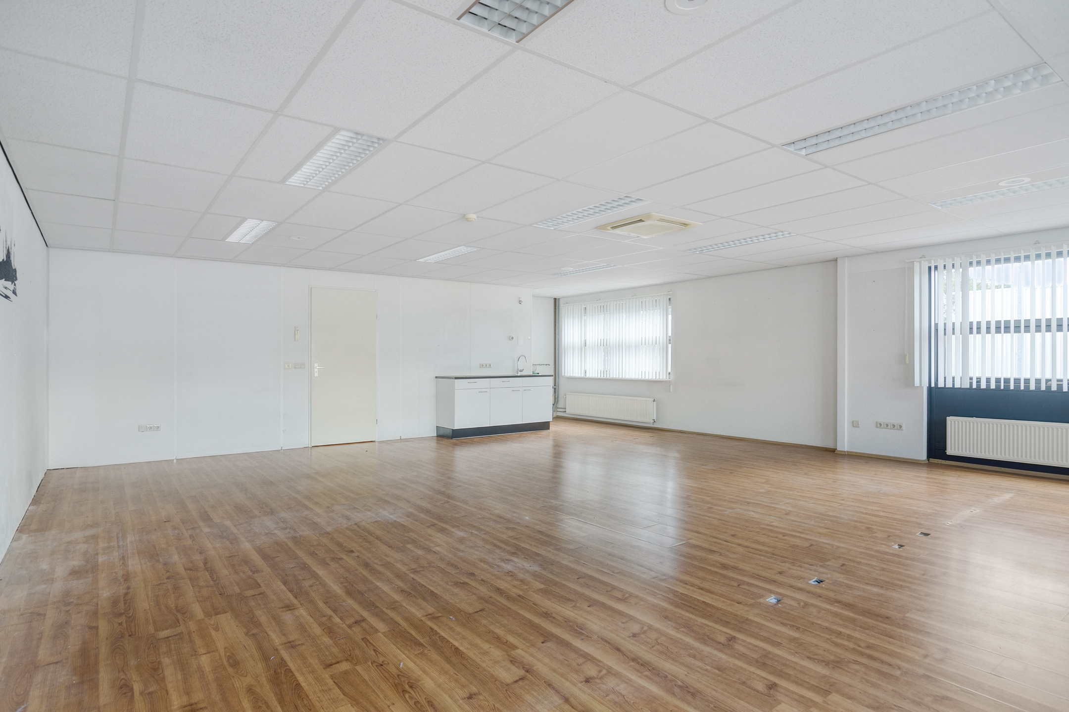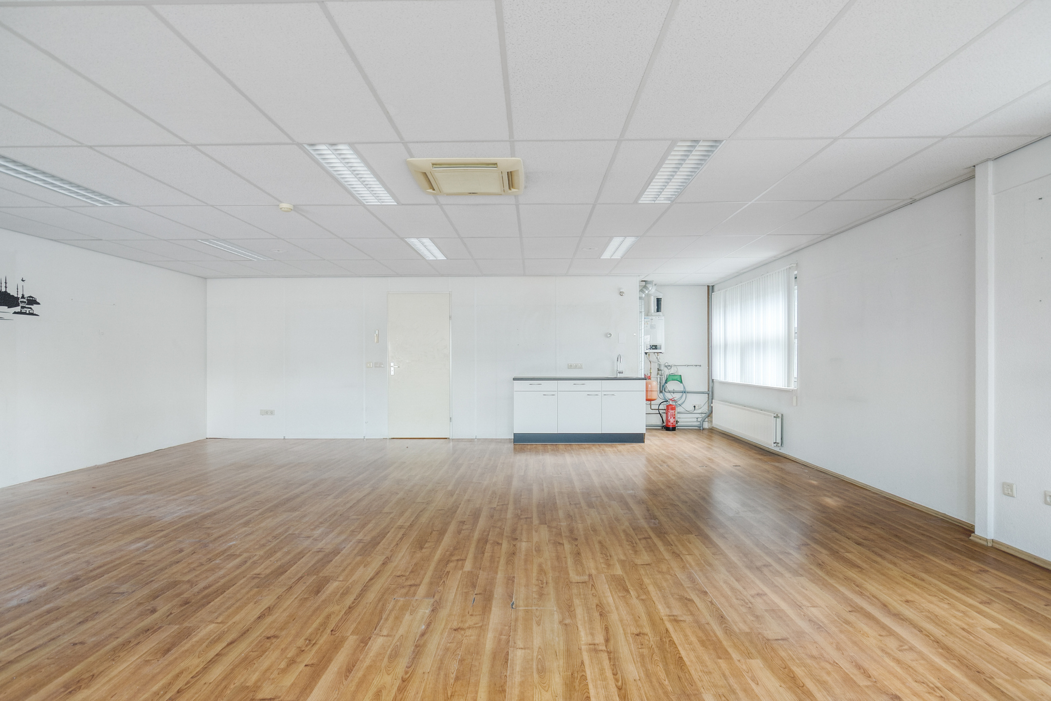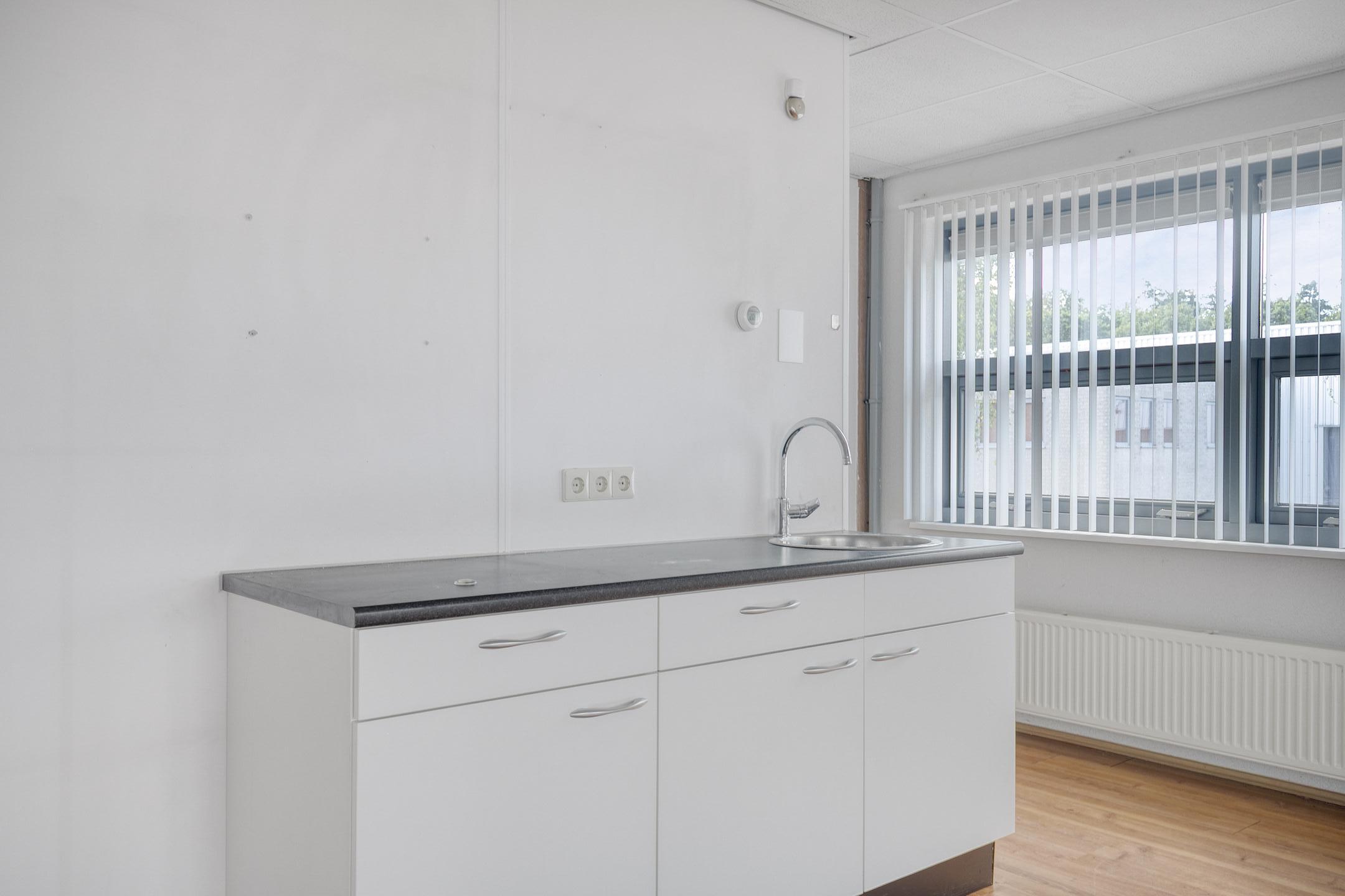 De kantoorruimte op de verdieping beschikt over een laminaatvloer, deels gecombineerd met een tegelvloer, een systeemplafond met inbouwarmaturen en een keukenopstelling. Tevens is de kantoorruimte voorzien van een airco-unit, die kosteloos (‘om niet’) ter beschikking wordt gesteld.