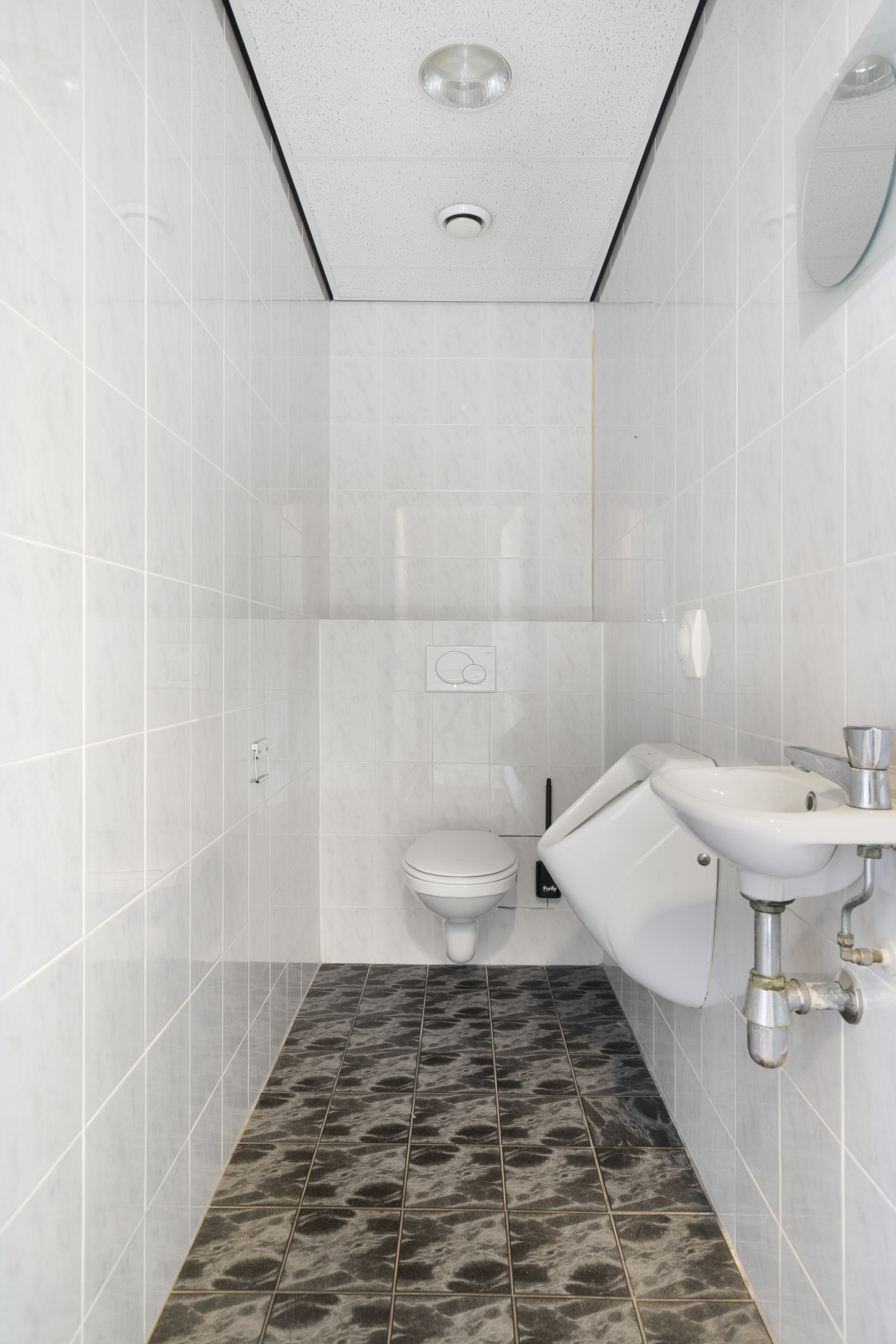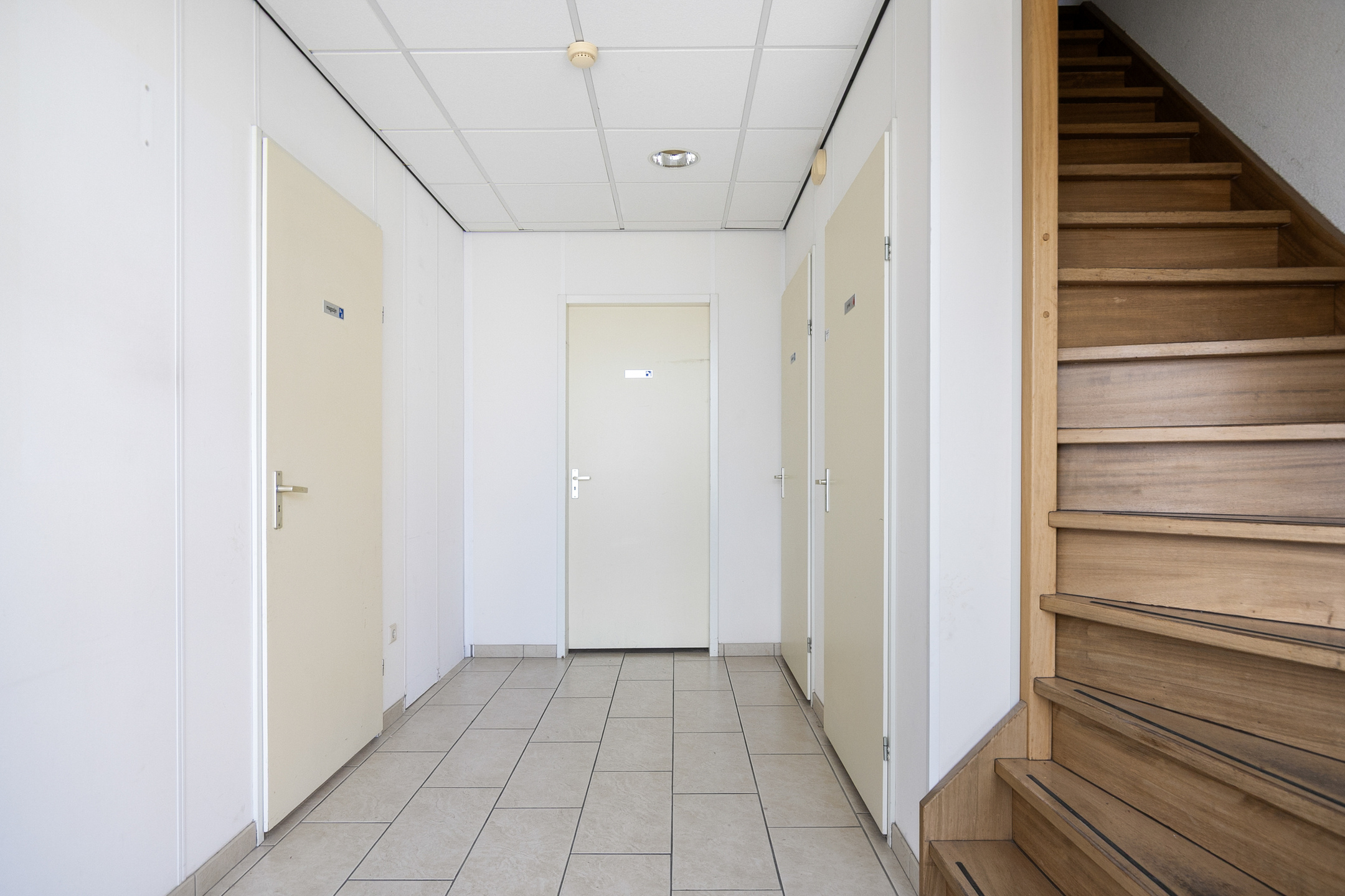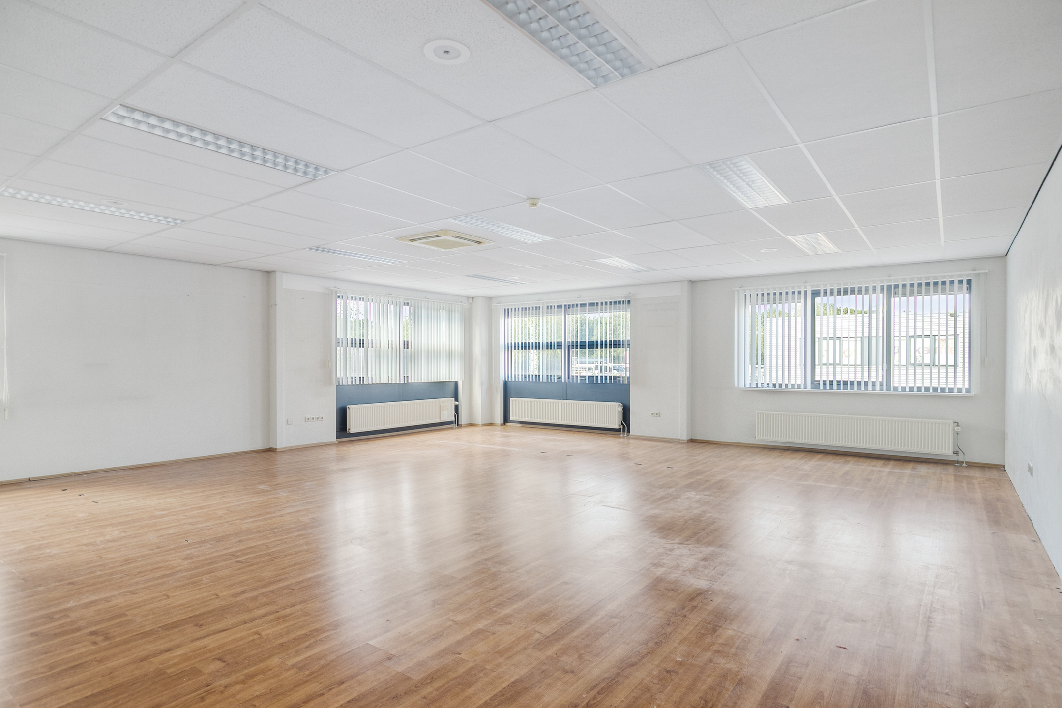 De kantoorruimte op de verdieping beschikt over een laminaatvloer, deels gecombineerd met een tegelvloer, een systeemplafond met inbouwarmaturen en een keukenopstelling. Tevens is de kantoorruimte voorzien van een airco-unit, die kosteloos (‘om niet’) ter beschikking wordt gesteld.