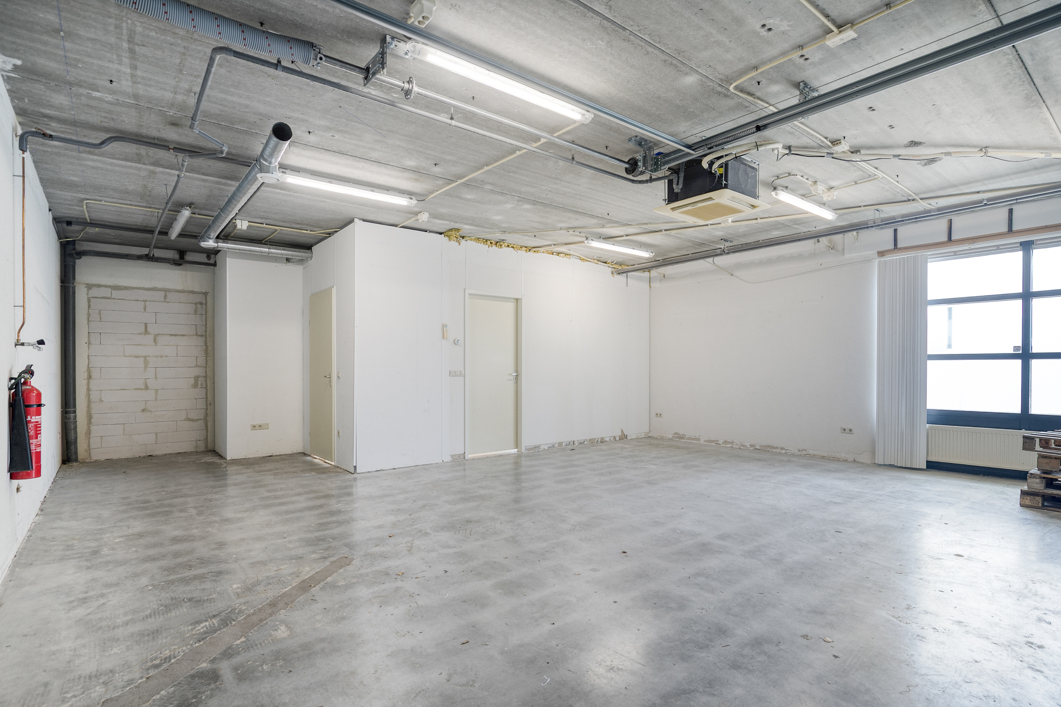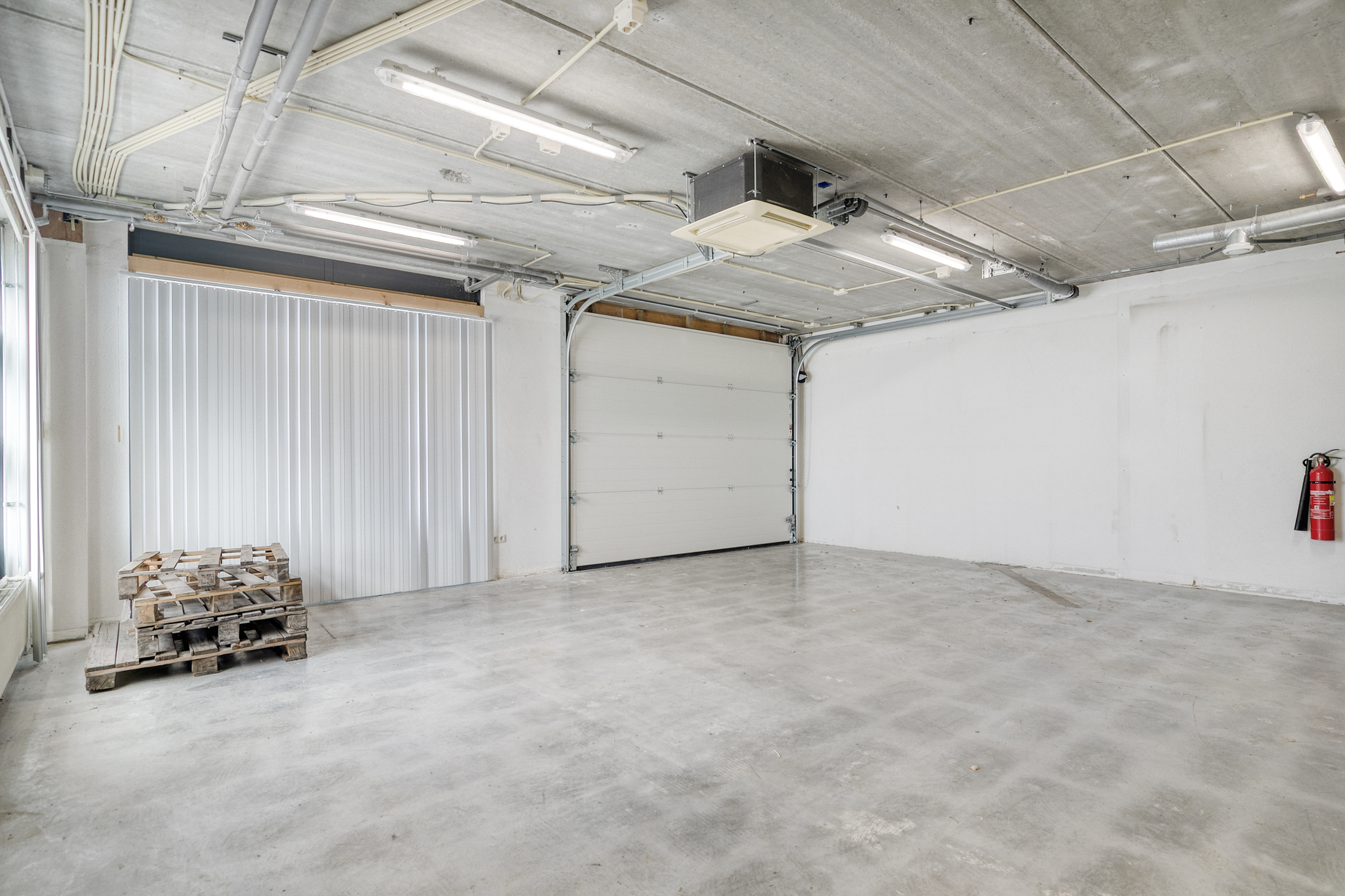 De bedrijfsruimte op de begane grond is voorzien van een betonvloer, een handmatig bedienbare overheaddeur en een toiletruimte. Verwarming vindt plaats via een cv-installatie met radiatoren. Daarnaast is de ruimte uitgerust met een poederblusser, rookmelder en TL-verlichting.