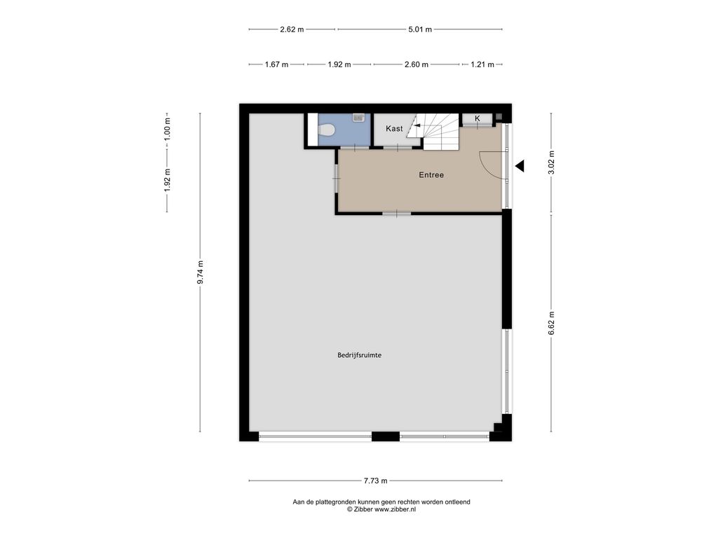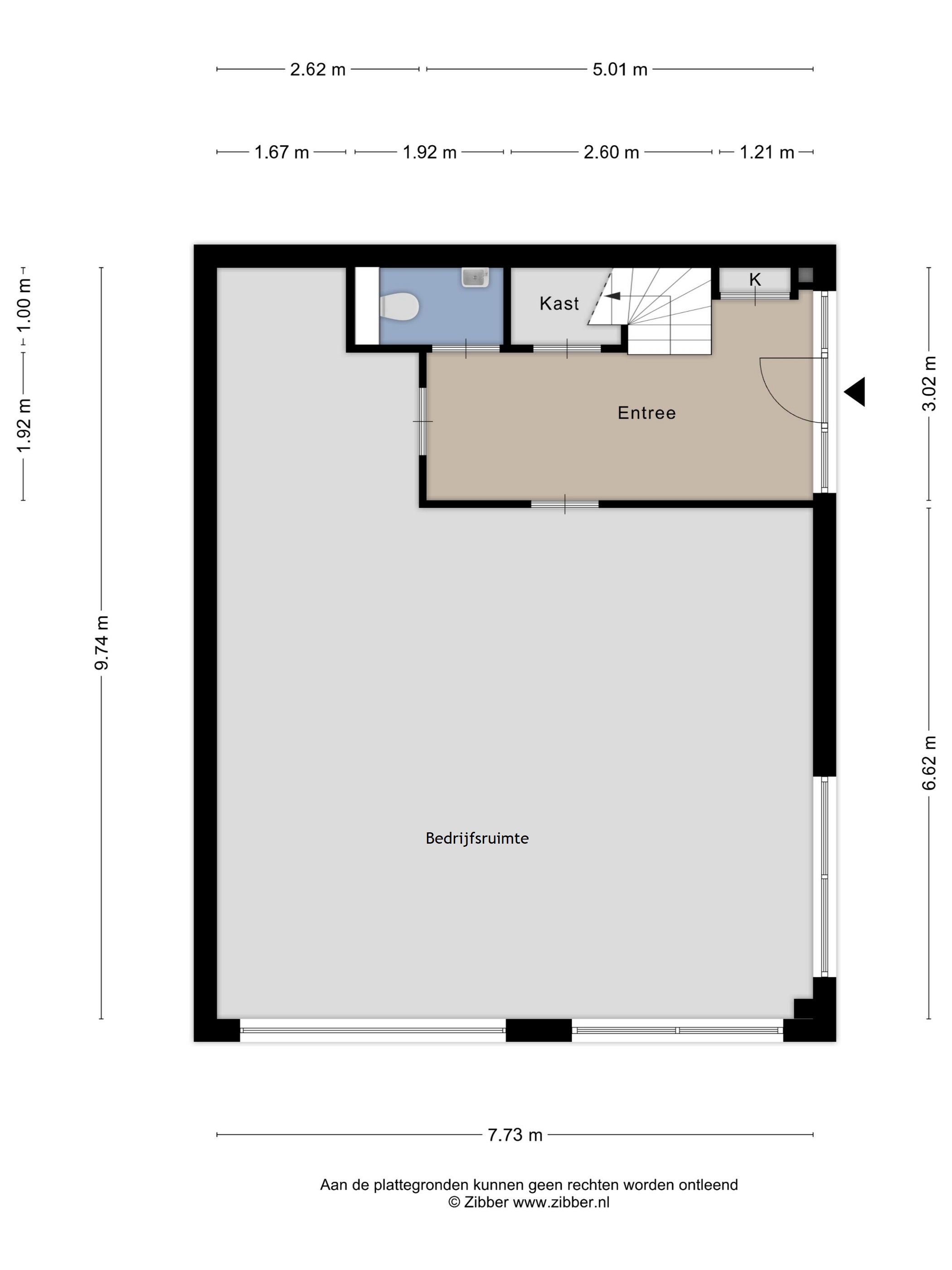 Entree middels loopdeur en overheaddeur, meterkast met eigen nutsaansluitingen, bedrijfs-/opslagruimte, toilet en trapopgang naar eerste verdieping, in totaal groot circa 75 m².