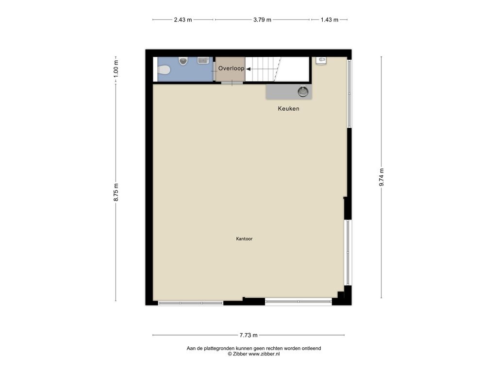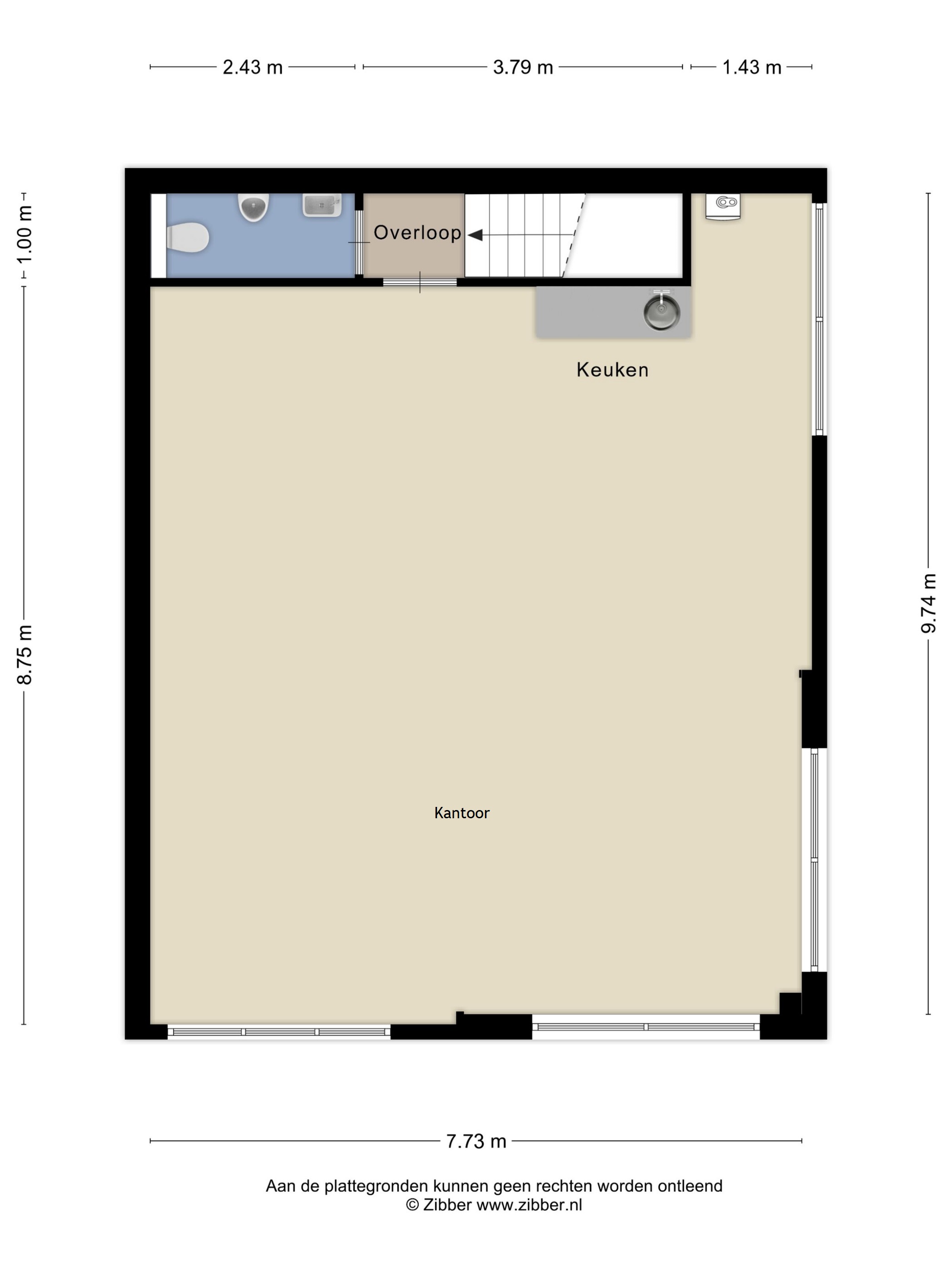 Via trapopgang te bereiken (betonnen) verdiepingsvloer, hal, één kantoorruimte, voorzien van keukenblok, in totaal groot circa 75 m².