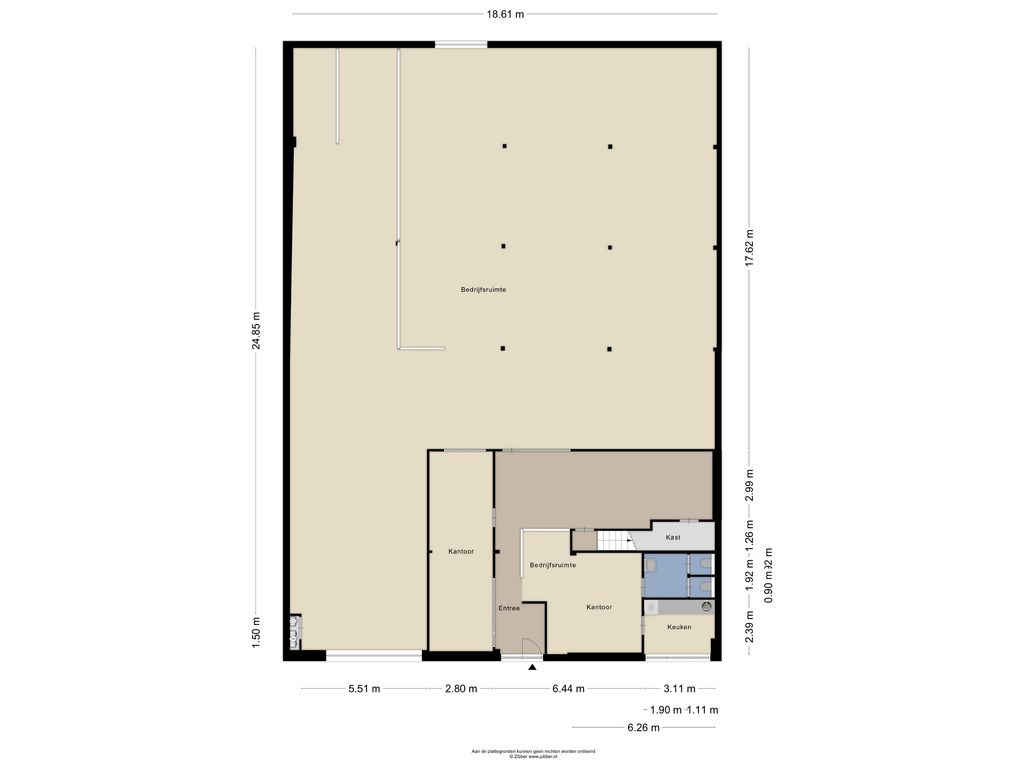 De bedrijfsruimte (vrije hoogte circa 5 meter) is voorzien van betonvloer, handmatig bedienbare overheaddeur (4 meter hoog), led-verlichtingsarmaturen, een lichtstraat en diverse elektra-aansluitingen. De aanwezige gasheaters behoren niet tot het gehuurde.