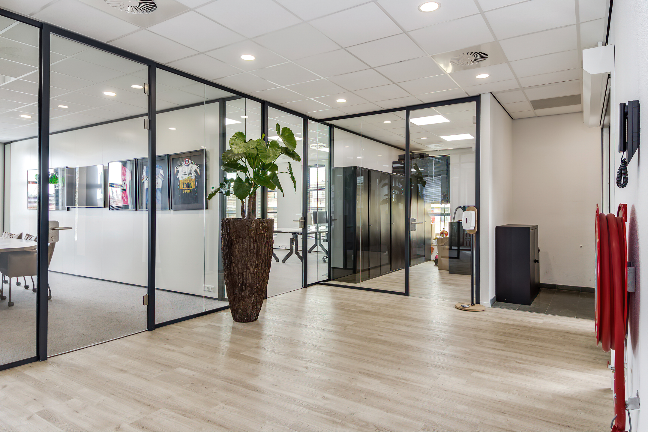 - kamerindeling door middel van vaste en glazen systeemwanden;