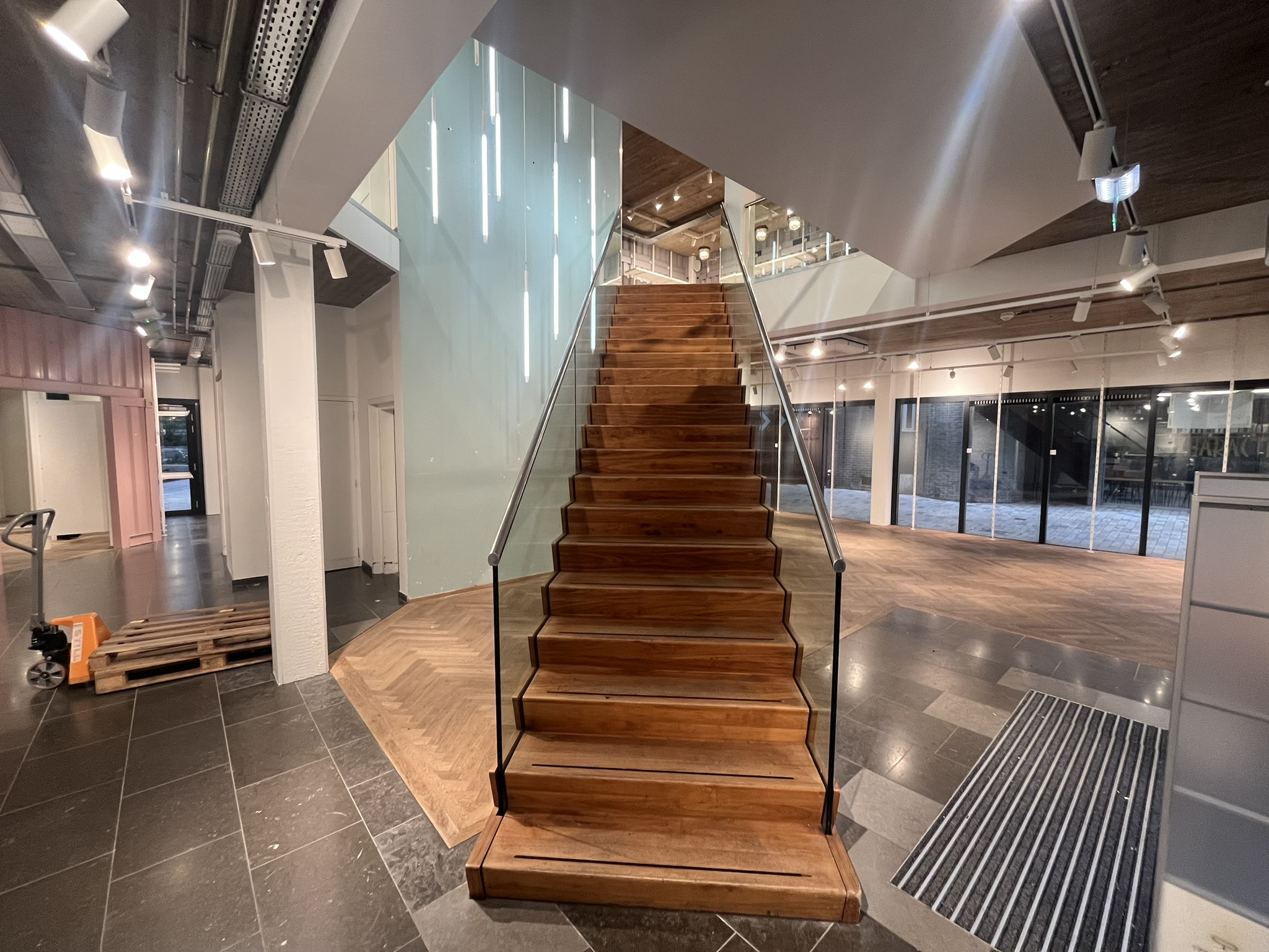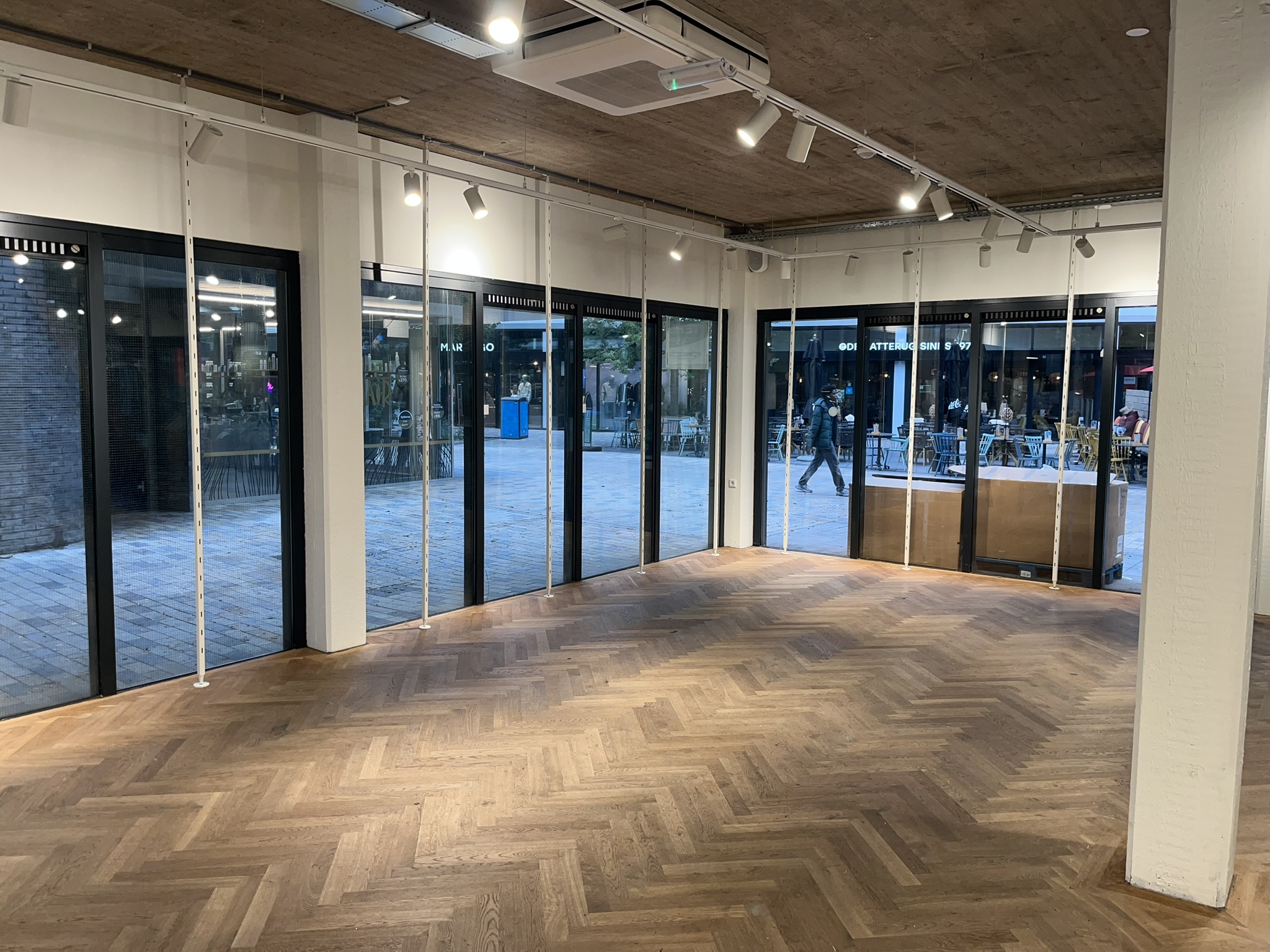 en een kelder. Het front heeft een breedte van circa 15 meter en is volledig voorzien van glas. De oppervlaktes zijn als volgt