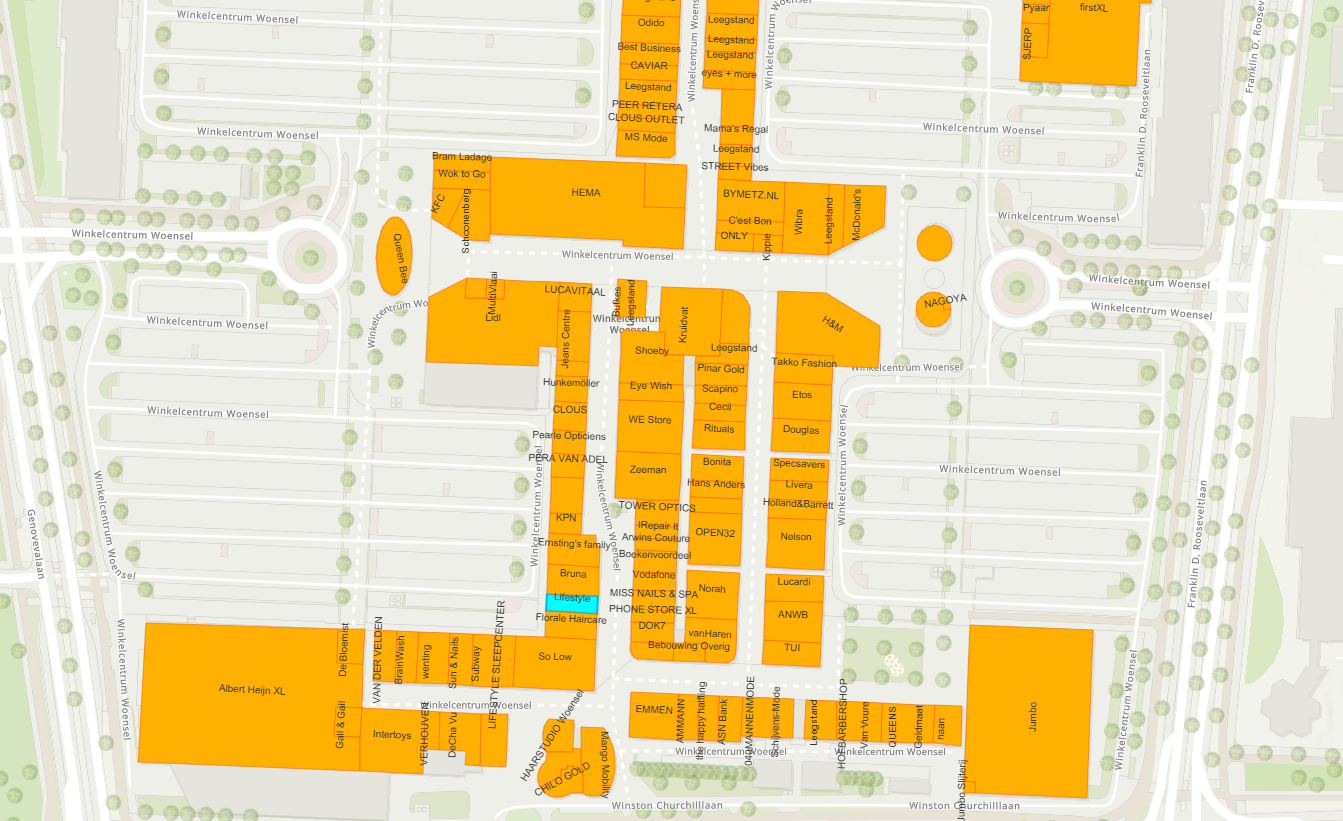 De voor verhuur beschikbaar komende winkelruimte is centraal gelegen in het stadsdeelcentrum Winkelcentrum Woensel. Het is met ruim 100 verkooppunten het tweede winkelhart van Eindhoven. Overige nabij gevestigde winkels zijn o.a. SoLow, Bruna, Emmen Schoenen, Ernsting's Family, Zeeman Textiel, WE Mode et cetera.